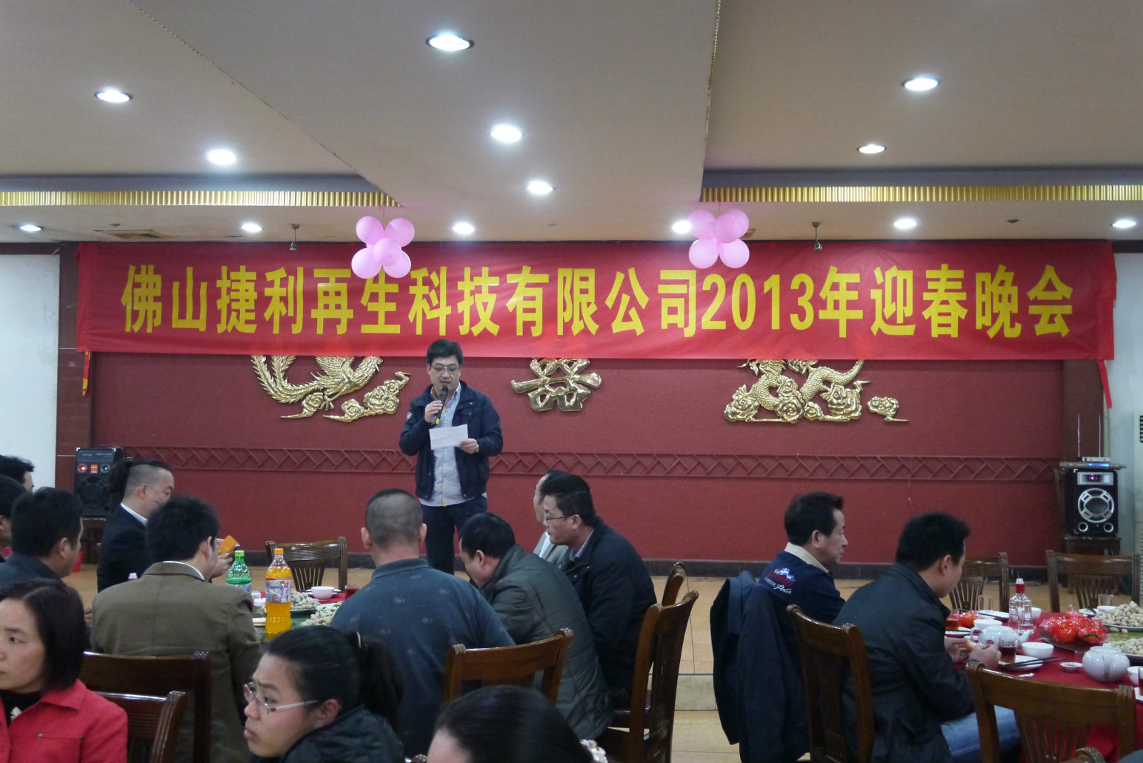 2013年2月23日晚,佛山捷利再生科技有限公司2013年迎春晚会在佛山市三水区大塘镇裕同山庄隆重举行。受邀的公司客户、供应商及友好人士和捷利全体人员一起出席了本次晚会。大家欢聚一堂,喜迎新春。晚会洋溢着欢乐祥和的气氛。